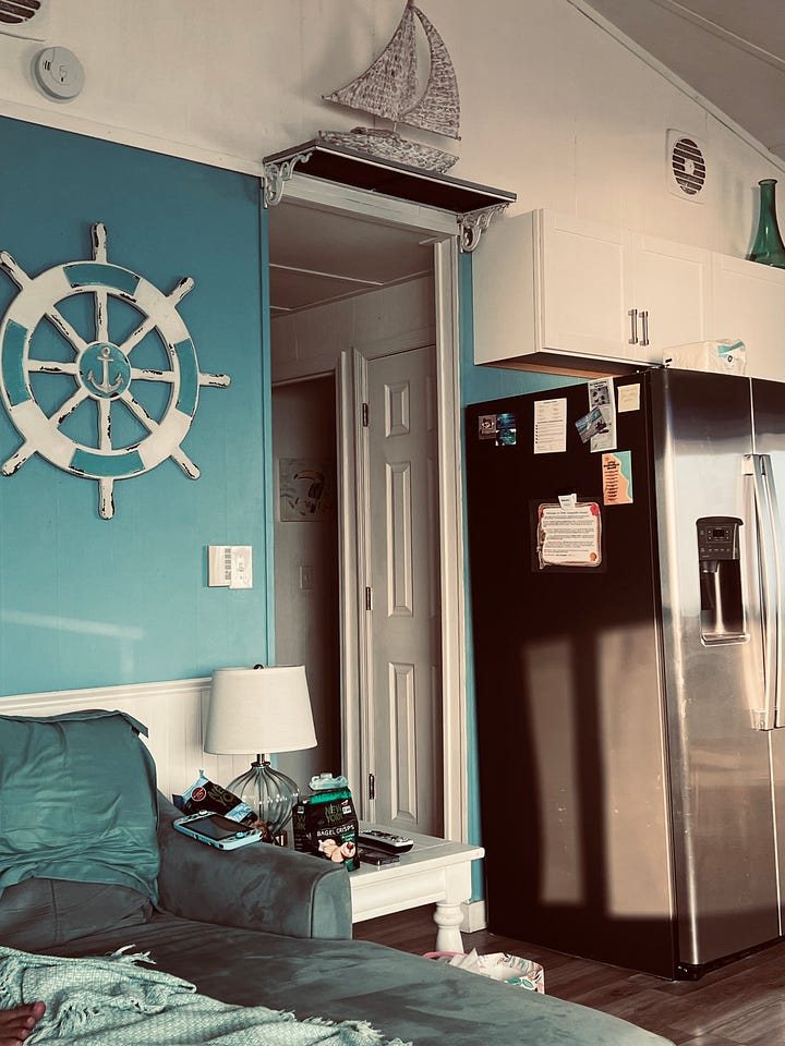 The cabin itself was adorable, a brightly painted round buttercup yellow cabin steps from the ocean. Inside, it had lots of windows and bright blue walls, white curtains with red coral patterns, and nautical paraphernalia everywhere! It had a television, clocks, a washer/dryer, and a set of bed sheets and towels for each room. It also had a fully stocked kitchen with appliances, spices, and other non-perishables such as sugar, coffee, rice, pasta, salt, cereal, and chips.